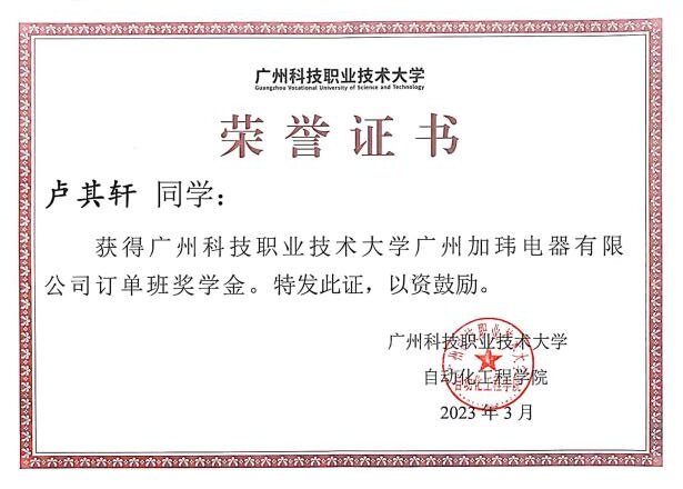 我院与广州加玮电器有限公司业签订校企合作订单班协议,岗位实习时与学生综合测评成绩挂钩,考核情况记入学生个人档案,作为发放毕业证书的重要依据之一。校企双方共同制订教学计划、课程设置、实训内容;学生的基础理论课和专业理论课由学校负责完成,学生的生产实习、岗位实习在企业完成,毕业后直接在合作企业就业,确保学生培养目标与企业人才需求标准“零”距离对接。校企双方设置订单班奖学金,奖励订单班表现优秀的学生。