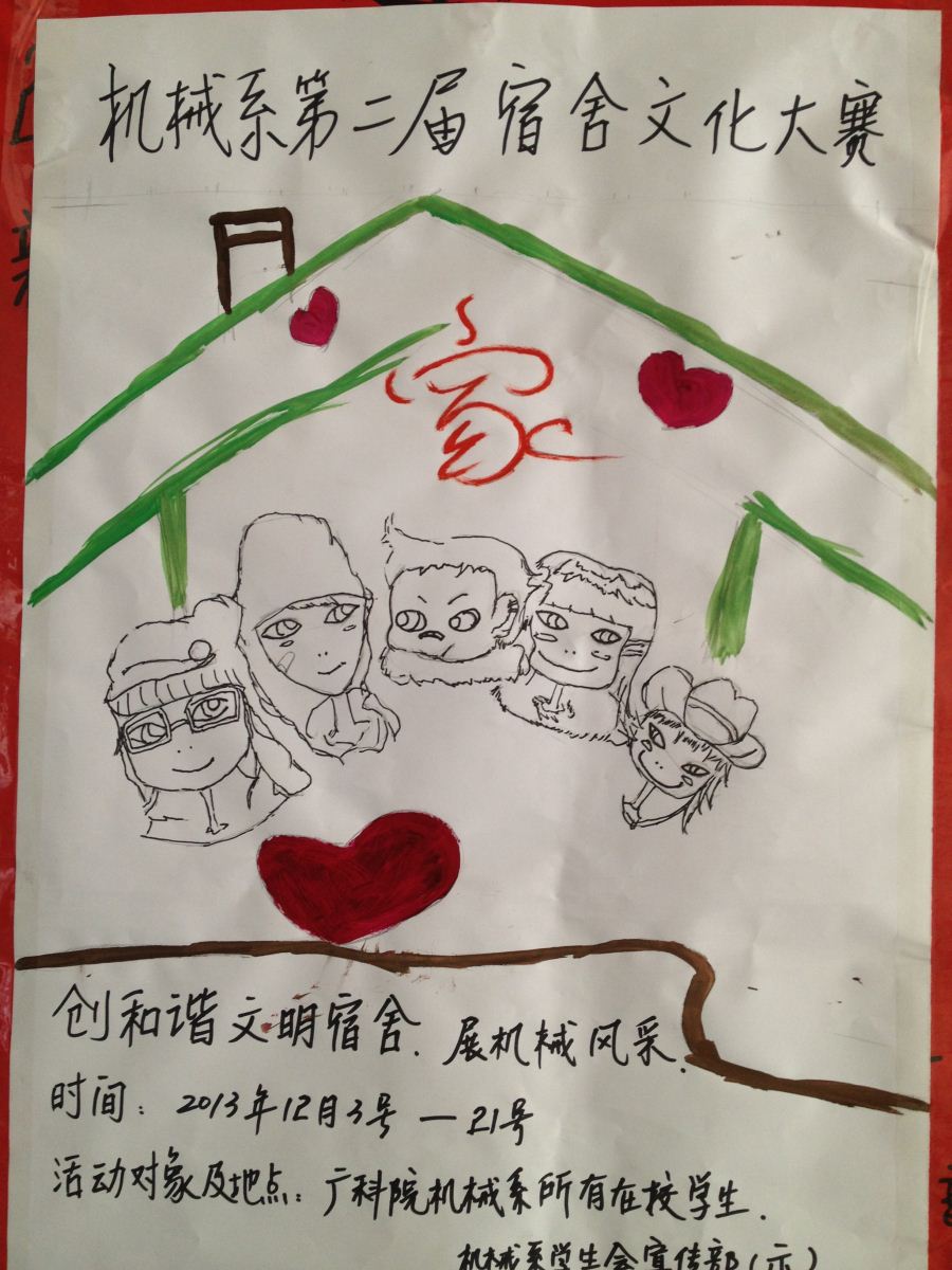 本次宿舍文化大赛以“创和谐文明宿舍、展机械风采”为主题,是继去年开展以来第二次在系部开展此类活动, 本次活动重在响应学院开展学生文明宿舍建设的号召,展示机械工程系学生宿舍成员的集体风采,加强机械工程系学生的文明修养提升宿舍文化品位,陶冶学生情操,营造健康、活泼、文明的生活氛围,进而丰富大学生寝室文化生活,推进学生宿舍文化建设,为同学们创造一个更加舒适、高雅、文明、健康的学习和生活环境。本届宿舍文化大赛由我系学生会生活部主办。