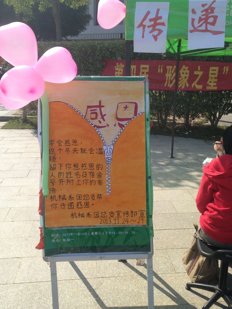 活动当天我系学子积极的利用课余时间将准备工作做好,并通过亲自制作由印有我院图片的明信片,进而填写明信片寄给自己想感恩的人。并将赠送填写明信片的同学一枚笑脸别针或气球。以此来传递冬日的温暖爱心。