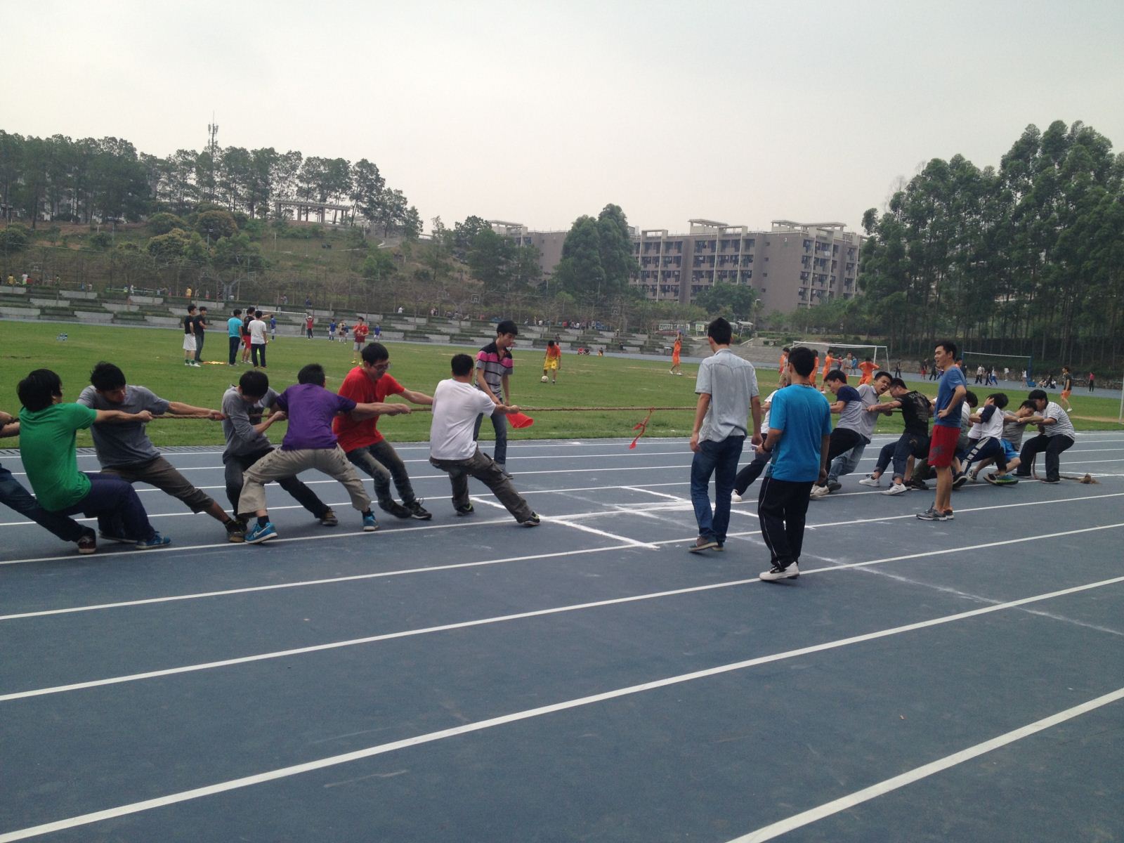 2014年4月16日下午,我系趣味拔河比赛在我院田径运动场如期举行,本次趣味拔河比赛属于我系今年体育文化节系列运动之一,重在通过趣味运动调动我系班级学子的积极性与团结性,丰富我系学子的课余文化生活。我系高立义副主任、党支部书记吴超、团总支书记刘东、蒋辉霞老师及其来自我系在校班级的代表队员及其同学参加此次趣味拔河比赛。