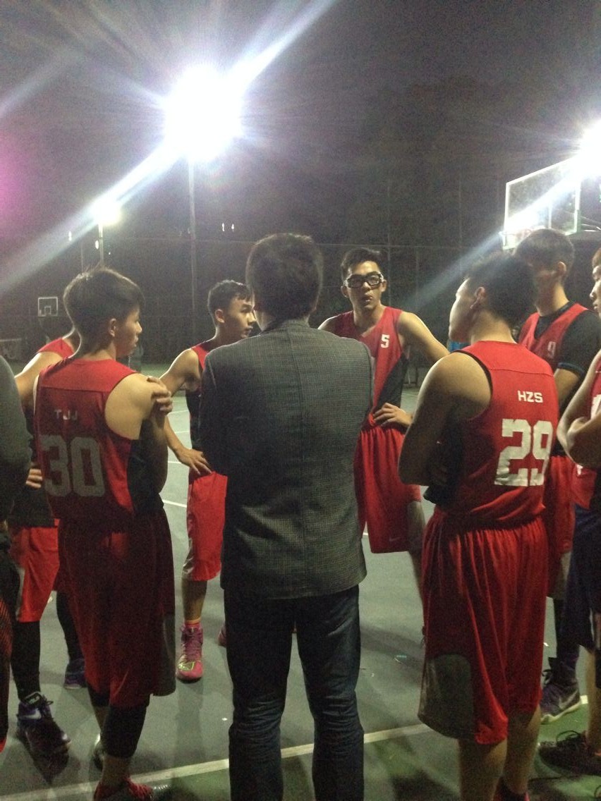 教练胡荣勋老师在一旁观战并不断给以指导,并在休息间歇召集队员调整战术。